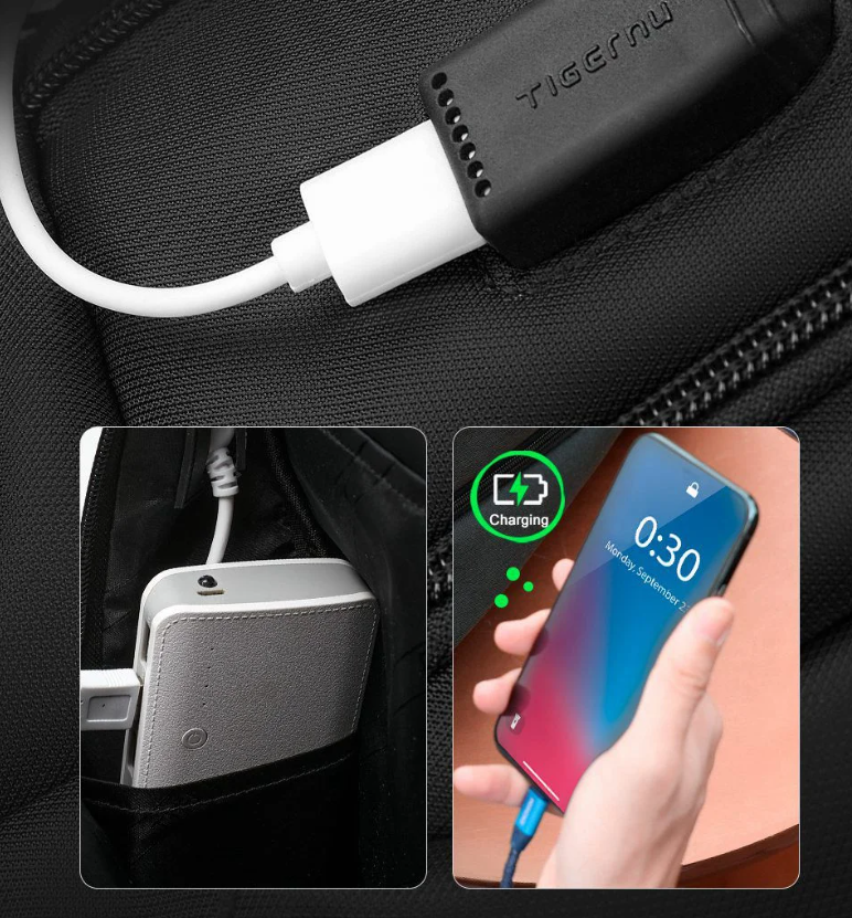 С вградения USB порт никога няма да останеш без заряд в ключов момент. Просто свържи външната батерия вътре в раницата и използвай външния порт, за да зареждаш удобно телефона си, докато си в движение – без да се налага да отваряш цялата раница или да търсиш контакт.